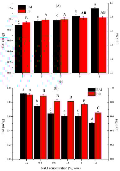 Effect of pH (A) and NaCl (B) on EAI and ESI. (Different lowercase and uppercase letters indicate a significant difference between EAI and ESI at p < 0.05).