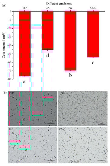 Zeta-potential is one of the predominant indicators to investigate the electrostatic interaction between the droplet surface. It is commonly acknowledged that the higher the absolute value, the stronger the electrostatic interaction, thereby exerting a positive influence on the stability of emulsions [21]. In particular, when it is higher than 30, it can be considered that the electrostatic repulsion can make the system stable, while little repulsion is more likely to coalesce rapidly because of the less interaction between the droplet particles [22]. As displayed in Figure 3, the zeta-potential values of the different emulsions stabilized by polysaccharides ranged from −45.13 mV to −76.40 mV, indicating a strong electrostatic repulsive force. Furthermore, the absolute value of the zeta potential of TFP was significantly higher than that of other emulsions (p < 0.05) and then followed by Pec, ascribing to the electrostatic shielding effect of different polysaccharides [23]. The differences in zeta-potential of various emulsions stabilized by TFP, GA, Pec, and CMC could be ascribed to the diversified structure of polysaccharides, such as the molecular weight, molecular size, and conformation [24,25,26]. Furthermore, the optical micrographs of emulsions could also be confirmed by this phenomenon, verifying the results of the previous analysis of stability and particle size. Though the oil droplets of all the emulsions were spherical and the sizes of GA emulsions were even smaller (more likely to coalescence and aggregation due to the low Zeta-potential), the particle size of TFP and Pec emulsions were more evenly distributed compared with GA and CMC emulsions.
