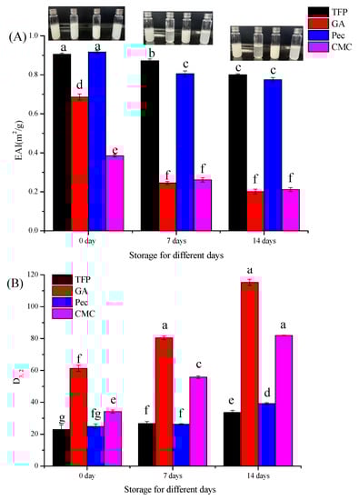 Storage stability is one of the crucial indicators for evaluating the physical stability of various emulsions [27]. Figure 4A was the EAI of different emulsions placed at room temperature for 14 days, and the corresponding appearance drawings were inset. It could be seen that the EAI of all the emulsions decreased throughout the storage period. The EAI of TFP and Pec emulsions were obviously higher than GA and CMC after storage for 7 and 14 days (p < 0.05), indicating higher resistance to creaming and the adsorption of more oil volume at the interface [11]. While in GA and CMC emulsions, rapid phase separation and apparent destabilization occurred after 7 days of storage, which could be intuitively proved by the inset digital photo. Besides, no significant difference was obtained between storage for 7 days and 14 days of GA, CMC, and Pec emulsions (p > 0.05), implying a decreased stability occurred during the first week. The EAI results were consistent with the results of surface-based mean diameter (D3,2) (Figure 4B). As the storage period increased, the D3,2 of all emulsions gradually increased, while TFP emulsions were stable with the lowest D3,2 after 2-weeks of storage. In short, TFP emulsion demonstrated low EAI increase and excellent storage stability during the storage period.