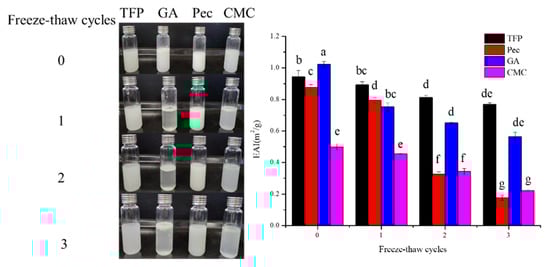 The effect of freeze-thaw treatment on the apparent morphology and EAI of different emulsions is displayed in Figure 5. As can be seen from the photo in Figure 5, the delamination phenomenon of GA and CMC emulsions gradually appeared with the increase of freeze-thaw treatment times, while no obvious phase separation was observed in TFP and Pec. TFS emulsions showed the best stability after three freeze-thaw cycles, followed by Pec with less oiling-off. While oil phase was precipitated in large quantities and EAI was decreased significantly (p < 0.05) in CMC and GA emulsions after two freeze-thaw cycles, indicating that the damage to membranes around the droplets resulted from freeze-thaw treatments [28].