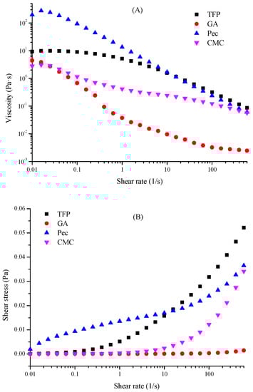 Viscosity is one of the most important parameters to illustrate the flow properties and will influence the appearance and consistency of emulsions. From the results of the steady-shear behavior measurements, it was found that with the increase of shear rate, the viscosity of all emulsions continuously decreased and demonstrated shear thinning behaviors (Figure 6A), implying the existence of network structure and weak interaction among the droplet-droplet particles. The shear force could not only destroy the entangled network of polysaccharides, but also disrupt the orientation of fibrils along streamlines, thereby leading to the reduction in viscosity [29]. Normally, the higher the apparent viscosity, the higher the emulsion stability. Consistent with the results of EAI of different emulsions, when compared to GA and CMC, the TFS and Pec illustrated relatively high apparent viscosity, which could be attributed to the various macromolecular compositions and polymer molecular chain orientation degrees [1,30]. However, the shear stress gradually increased especially at higher shear rates due to the disruption of O-W interfaces (Figure 6B) [16]. Like the viscosity, TFP and Pec illustrated the higher shear stress, and especially at a higher shear rate the shear stress of TFP emulsions surpassed Pec emulsions, stating that under external force less deformation and stronger interaction force of TFP was observed compared with Pec [31]. This phenomenon could be perfectly verified by the result of the viscosity, since strong shear stress could give rise to the emulsion droplets rearrangement, which not only amplified the steric hindrance effect but also intensified the intermolecular friction among polysaccharides, consequently, the viscosity was enhanced [32].