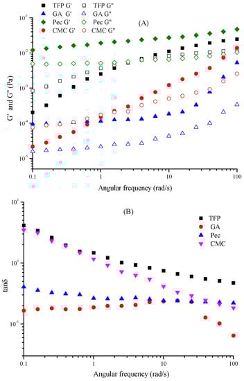 Before frequency sweep, the oscillation amplitude strain sweep experiment (0.01–100%) was carried out at an angular frequency of 10 rad/s to obtain the linear viscoelastic region (LVR). It was observed that different emulsions demonstrated a constant storage modulus (G′) and viscous modulus (G″) in the oscillatory stress range of 0.01–1% (data not shown). Then the frequency sweep was conducted at an angular frequency of 0.1 to 100 rad/s at a fixed oscillation strain of 1% (within the LVR) to study the viscous and elastic behavior changes. For Pec and GA emulsions, no crossover point (G′ = G″) was discovered and G′ was always higher than G″, manifesting gel-like behavior with more accessibility to an ordered network structure [35]. While for TFP and CMC, there was a crossover point (G′ = G″) within the tested range. It could be seen in Figure 7A that G″ of TFP and CMC emulsions were higher than G′ at low frequency, showing a viscous characteristic of a liquid. This owed to the sufficient stress relaxation time of the polymers allowed them to deform slowly, and then most of the energy would be dissipated, leaving a little energy in the emulsion [31]. However, G′ exceeded G″ at high frequency, illustrating an elastic characteristic similar to a solid. This was because the relaxation time was cut down with the enhancement of frequency, and a solid-like network structure was gradually generated, thereby preserving the energy until G′ > G″ [31].