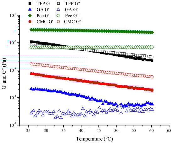 In order to evaluate the sensitivity of different emulsions to temperature changes, a temperature sweep was carried out. As illustrated in Figure 8, melting was found in TFP emulsion during the temperature range, demonstrating that there was a transformation from a solid state to a liquid state as temperature increased. It was also discovered that Pec emulsion had dominance over elastic behavior (G′ > G″) and formed structured gels, while CMC demonstrated a viscous behavior (G″ > G′). Though GA showed similar results to Pec (G′ > G″), the G′ and G″ values were quite low, which resulted from the low probability of collision between particles [38,39].