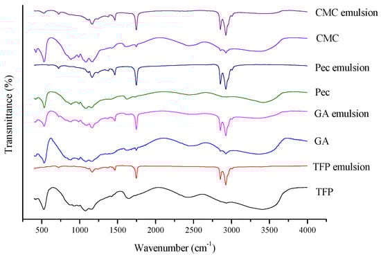 FTIR of TFP, GA, Pec, and CMC and its corresponding emulsions.