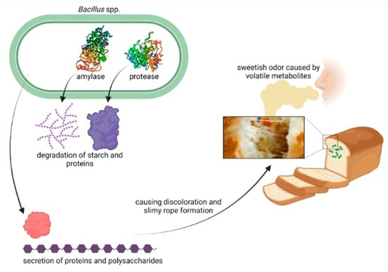 Bacillus spp. is a gram-positive, rod-shaped, aerobic or facultative anaerobic, motile, and endospore-forming bacterium []. The presence of endospores in raw ingredients and foods is practically impossible to prevent due to the ubiquitous occurrence of Bacillus spp. in nature []. Bacillus endospores are not only heat stable and able to survive baking in the center of the bread crumb, but they are also highly resistant to desiccation, radiation, and chemical agents [,]. Intracellular endospore formation is triggered by nutrient starvation, with subsequent cell lysis and the release of spores []. If conditions are favorable, for instance temperatures above 25 °C in combination with an aw ≥ 0.95 and pH > 5, spore germination and growth can lead to spoilage (Table in Section 3) []. Rope formation may occur in localized high-moisture areas inside the bread loaf []. Ropiness is associated with a patchy discoloration and a stringy bread crumb, and characterized by an unpleasant sweetish odor resembling rotting melons or pineapples that is caused by the release of volatile compounds including diacetyl, acetoin, acetaldehyde, and isovaleraldehyde (Figure 1) [,,]. In advanced stages, the bread crumb can be almost liquefied and forms long, silky, web-like strands when pulled apart, as depicted in Figure 1, giving rise to the designation of rope spoilage [,,]. This phenomenon mostly occurs in high-moisture bakery products during summer months or countries with moist and hot climates [,]. The production of extracellular slimy polysaccharides and proteins, as well as the production of proteolytic and amylolytic enzymes that degrade the bread crumb, is characteristic of rope-forming bacterial species (Figure 1) [,,,].