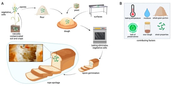 The type and rate at which rope spoilage occurs is influenced by the type of bacterial strain and its endospore heat resistance, as well as its spoilage ability. A number of intrinsic and extrinsic factors related to the food and its storage, such as loaf type, pH, aw, microbiological species, and potential antagonisms between species (Figure 2B), also play a role, and the type and quantity of produced enzymes may vary in different strains of the same species or even within the same strain under different cultural conditions [,]. Therefore, high cell concentrations of spore-forming bacteria in bread do not automatically result in rope spoilage [,,]. Valerio et al. [] compared two B. amyloliquefaciens wild-type strains with B. amyloliquefaciens ATCC 8473 in order to assess their growth behavior and spoilage risk during bread shelf life. The results of this study highlight a higher rope spoilage potential in the isolated wild-type strains compared with the commercially available ATCC strain [].