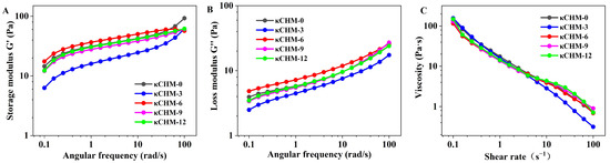 Dynamic rheological properties of κCHM film-forming solutions. (A) Storage modulus G′, (B) loss modulus G″ and (C) viscosity of film-forming solutions.