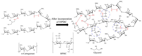 Generally, the MC of the film reflects not only the possible influence of the interaction between the components in the film on the affinity of the film to water, but also the ability of each component to hold water molecules [33]. WS of the film provides information about the combination degree among components in composite film [33]. As listed in Table 1, there was no significant difference in MC among all films (p > 0.05). WS was obviously decreased with the addition of HPMC (p < 0.05). This may be due to the formation of hydrogen bond interactions between HPMC and κ-carrageenan (Figure 2).