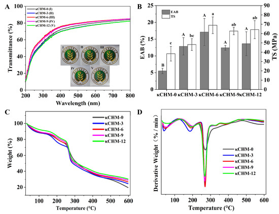 (A) Light transmittance, (B) mechanical properties, (C) TGA thermograms and (D) DTG curves of κCHM films. Abbreviations: TS, tensile strength; EAB, elongation at break. The data of TS and EAB are expressed as mean ± standard deviation with n = 5. Different letters for the same test parameter indicate significant differences among different groups (p < 0.05). TS, tensile strength; EAB, elongation at break.