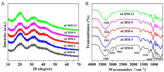 The diffraction pattern of all κCHM films exhibited two clear diffraction peaks around 20.4° and 32.5° (Figure 4A). For the pure κ-carrageenan film, the broad and diffuse peak reflected the amorphous structure of the κ-carrageenan [44]. Its relative crystallinity was 15.29%. The incorporation of HPMC into the κ-carrageenan-based films did not generate new diffraction peaks in the XRD patterns, indicating that HPMC did not considerably change the amorphous structure of the κ-carrageenan. The significant increase in peak intensity of κCHM-3 and κCHM-12 films at diffraction peaks suggested an increase in crystallinity (17.29% for κCHM-3 film, 17.91% for κCHM-12 film). The increase in crystalline aggregates hindered the transmission of light [33]. These data could further explain why the κCHM-3 and κCHM-12 films had lower light transmittance. The changes in peak intensity of κCHM-6 and κCHM-9 films were not clear. The relative crystallinities were 15.51% and 16.02%, respectively. κCHM-6 film had lower relative crystallinity; thus, we suggest that 6% HPMC had better compatibility with κ-carrageenan.