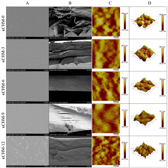 Figure 5 shows the surface and cross-sectional SEM images and surface topography of κCHM films. As seen in Figure 5A,B, the κCHM-0 film shows a relatively smooth surface, and exhibits discontinuous internal structure with large cavities. The latter may be related to the addition of glycerol, which weakens the interaction between κ-carrageenan molecules, increases the free volume of molecules and forms cavities [32]. With the addition of HPMC, the surface of the film changed significantly. It can be seen that there were visible bulges similar to bubbles on the surface of the κCHM-3 film and the κCHM-12 film, and white aggregations appeared on the surface of the κCHM-12 film (Figure 5B). These bulges may affect the optical properties of the films. As presented in Figure 5C, the κCHM-6 film shows a flat and smooth surface, demonstrating that there was better compatibility between HPMC and κ-carrageenan when the HPMC concentration was 6%. Moreover, the internal structure of the κCHM-6 film was the most compact and dense (Figure 5B). A smoother surface reduced light scattering and internal ordered film structure reduced obstacle of light transmission through the film; this might contribute to higher light transmittance of κCHM-6 and κCHM-9 films [24]. On the contrary, the cross-sectional images of other HPMC-containing film formulations showed varying degrees of discontinuity and even severe delamination. Compared with the κCHM-0 film, the internal cavities of the HPMC-containing films gradually disappeared, which may be because the addition of HPMC filled these pores, cross-linked and reorganized the polymer molecules, and thus changed the film structure.