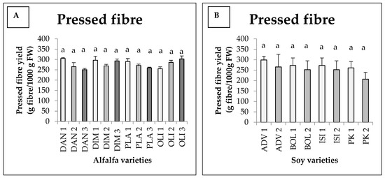 Average press fibre yields of different alfalfa (A) and soy (B) varieties as a function of harvesting time (+SD). Different letters above the columns refer to significant differences (p ≤ 0.05). FW = Fresh weight.