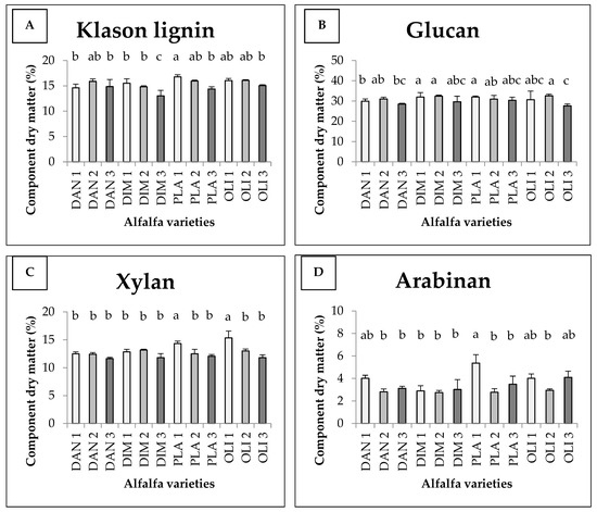 Average Klason lignin (A) contents and glucan (B), xylan (C) and arabinan (D) components of different alfalfa varieties as a function of harvest time (+SD). Different letters above the columns refer to significant differences (p ≤ 0.05).
