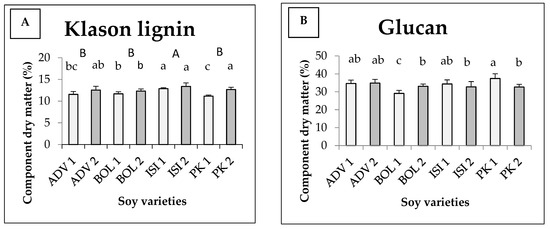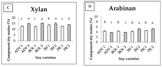 Average Klason lignin (A) content and glucan (B), xylan (C) and arabinan (D) components of different soy varieties as a function of harvest time (+SD). Different letters above the columns refer to significant differences (p ≤ 0.05). In Figure 3A, the capital letters (A,B) indicate varieties; the normal letters (abc) indicate the harvest.