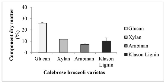 The glucan content (25.97 w/w%) was less than those for the first two species. The xylan content was 11.77 w/w%, while the arabinan content was 7.2 w/w%. The value of 10.19 w/w% of Klason lignin (Figure 4) was lower than that of alfalfa and soy, which is also due to the fact that, in the case of broccoli, it is the leaf and the petiole that can be a source of fibre, being left as byproducts after the utilisation of the inflorescence for food.
