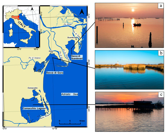 Geographic setting and locations of the investigated northern Adriatic lagoons within the Po River delta area in Italy. Photos of (a) Sacca di Goro; (b) Sacca di Scardovari; and (c) the Comacchio Lagoon.
