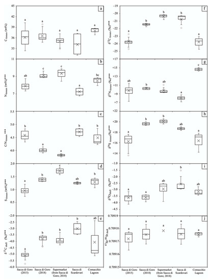 Box plot of elemental and isotopic compositions of carbon (C), nitrogen (N), sulfur (S), oxygen (O), and strontium isotope composition (87Sr/86Sr) in the tissues (a–d; f–h) and shells (e; i–j) of manila clam samples collected on-site from northern Adriatic lagoons and bought at the local supermarket. In each box plot, the black line and the black cross represent the median and the mean, respectively. Above the box plots, the letters represent the results of the Tukey’s HSD post hoc test: different letters denote significant differences among groups. The one-way ANOVA results are also reported (** p < 0.001; *** p < 0.0001); where the asterisks are missing the groups are not statistically different.