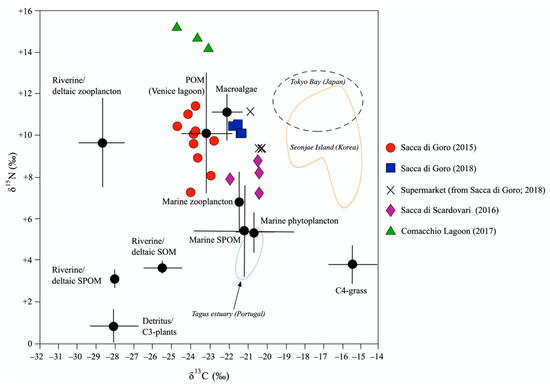 Comparison of carbon (C) and nitrogen (N) isotopic compositions of manila clam tissues from northern Adriatic lagoons with those from (i) fisheries worldwide (Tagus estuary, Portugal [30]; Tokyo Bay, Japan [44]; Seonjae Island, Korea [45]) and with (ii) potential organic sources collected in the Po delta area [38] and in the Venice lagoon [39]. The analytical uncertainties are negligible at the graphical scale.