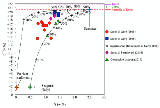 Sulfur (S) content vs. δ34S of tissues of manila clams collected on-site from northern Adriatic lagoons and bought at a local supermarket. The elemental and isotopic values of S for seawater are from Adriatic marine plankton of Giani et al. [54] and Borrell et al. [55], respectively. The values for Po River sediments are from Salani et al. [56], and for seagrass, they are from Holmer and Nasler-Sheetal [57]. Tick marks on the seawater–riverine mixing lines indicate the contribution of seawater. The average δ34S values from China, Democratic People’s Republic of Korea (DPR), and Korea from the study of Won et al. [11] are also represented for a comparison. The analytical uncertainties are negligible at the graphical scale.