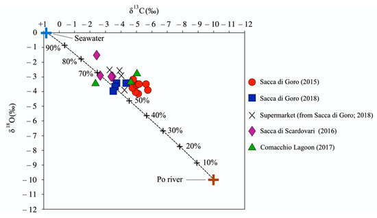 The δ13C and δ18O isotopic ratios of shells of manila clams collected on-site from northern Adriatic lagoons and bought at a local supermarket. The isotopic ratios of C of dissolved inorganic carbon (DIC) for seawater and the Po River are from Hoffman and Lamothe [64] and Marchina et al. [15], respectively, whereas the isotopic O of seawater is the typical value for Standard Mean Ocean Water (SMOW), and that of the Po River is from Marchina et al. [15]. Tick marks on the seawater–riverine mixing line indicate the contribution of seawater. The analytical uncertainties are negligible at the graphical scale.