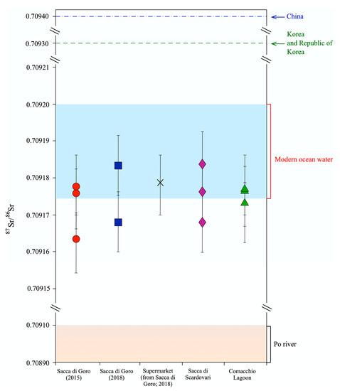 The 87Sr/86Sr isotopic ratios of shells of manila clams collected on-site from northern Adriatic lagoons and bought at a local supermarket. The isotopic ratios of manila clam tissues from China, Democratic People’s Republic of Korea, and Korea [11], modern ocean water range [68,69,75], and Po River range [66,67] are reported for comparison. The errors bars of the analyses are also represented.