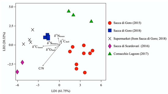 In the previous sections, we explained that each isotopic parameter of manila clams variously reflects the environmental conditions and/or food sources of the lagoon of provenance, precluding the possibility of their use alone as exclusive provenance tracers at the local (small) scale. However, we explored the potential of their use in clam traceability when combining the information provided by each tracer using a multivariate statistical approach. In this framework, an LDA was performed to discriminate the lagoons of provenance of the manila clams. LDA is a statistical approach that maximizes the separation of known categories [76] and is one of the most popular models for food authentication [77]. To perform the LDA, we chose the C/N and the stable isotopic ratios as parameters, excluding the Sr isotope, as the differences in 87Sr/86Sr values among the manila clam groups is not relevant. The validation of the model was obtained by the LOOCV procedure. The resulting LDA explains 82% of the total variance, with linear discriminant 1 (LD1) accounting for 61.75% and linear discriminant 2 (LD2) for 20.32% (Figure 7). In the LDA plot (Figure 7), the manila clam samples are well clustered into five groups reflecting the lagoon of provenance and, in the case of Sacca di Goro, the year in which the clams were collected. Coherently, the clams bought at the supermarket and those collected in Sacca di Goro in 2018 were plotted in the same area of the diagram, with δ13C, δ15N, and C/N of the manila clam tissues being the most discriminant parameters among the two groups. Therefore, the C and N compositions of the different (marine and continental) food sources seem to play a crucial role in tracing manila clams at the local scale. However, the exclusive use of the C and N isotopic ratios of tissues does not allow one to trace the exact lagoons of provenance of the samples (Figure 3). The apparent small contribution provided by the δ34S values of tissues, and the δ13C and δ18O values of the shells, is therefore fundamental to separate the groups, as these parameters are related to the environmental settings, which are characteristic and unique for each lagoon. In order to take into account all of the different contributions provided by these variables for the traceability of manila clams, multivariate analysis certainly represents the best statistical tool, especially in terms of highlighting differences at the local scale. The LDA also shows that samples collected in Sacca di Goro in 2015 and 2018 are well clustered in two distinct groups, demonstrating that samples from the same location but collected in different years are characterized by significantly different C, N, O, and S isotopic signatures. This means that the variability of climate and environmental factors plays a crucial role in the manila clam isotopic compositions. Therefore, for the correct authentication of the seafood products, an exhaustive archive that reports the isotopic signatures of products from different locations should be created and annually updated.
