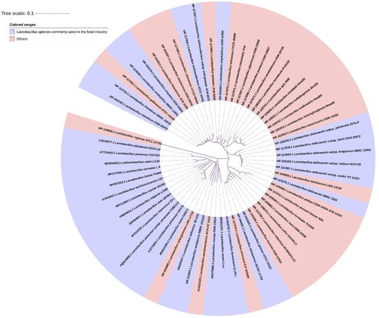 Neighbor-joining phylogenetic tree based on 16S rRNA gene sequences showing the relationship between known species in Lactobacillus, produced and rendered by an online tool—Interactive Tree of Life (https://itol.embl.de/, accessed on 21 March 2022) [43]. The lilac background color represents Lactobacillus species commonly used in the food industry (including fermented fish products, fermented dairy products, fermented soy products, fermented starch foods, fermented fruit and vegetable, fermented meat products, etc.), and the pink background color represents others (including human gastrointestinal tract, vagina, oral cavity, etc.).