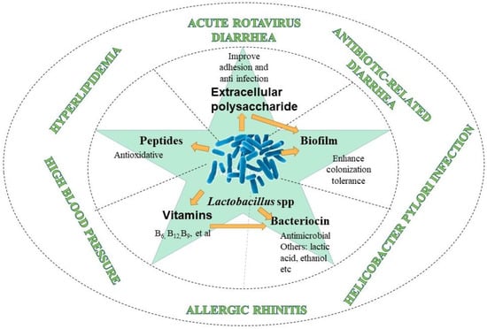 From the functional characteristics, the existence of Lactobacilli strains in the intestinal microbiota is related to the host’s health status [122,123]. Clinical research showed that the reduction or increase in the proportion of this genus in the human body would produce health problems, such as irritable bowel syndrome [124], human immunodeficiency virus [125], obesity [126], type 2 diabetes [127], etc. Several strains with probiotic properties of specific metabolites have been successfully included in various functional foods (Figure 3). Although the mechanism of their role is uncertain, the health-promoting effect of these strains is related to the strains themselves and their active metabolic substances (such as extracellular polysaccharide, bacteriocin, polypeptide, short-chain fatty acid, etc.). Several meta-analyses and systematic reviews [128,129,130,131,132,133] support the health effects of probiotic Lactobacilli strains and specific metabolites produced by Lactobacilli strains in treatment cases, including acute rotavirus diarrhea in children, antibiotic-related diarrhea in children, Helicobacter pylori infection, allergic rhinitis, high blood pressure, hyperlipidemia, and other diseases. Additionally, based on its excellent physiological characteristics and probiotic function, Lactobacillus has become an important direction in the field of probiotic function. Given the specificity of the Lactobacilli strains, the new strains may have potential unique functional characteristics. Table 4 summarizes several vital functions of Lactobacilli strains.