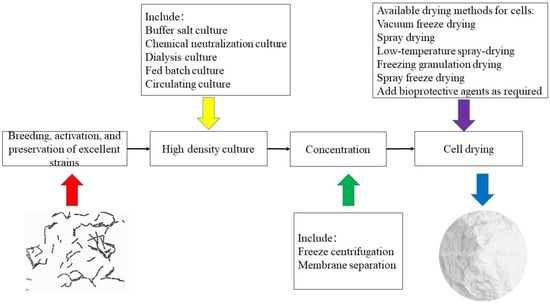 Fermented food has experienced the methods of natural fermentation, inoculation fermentation, and pure culture fermentation, that is, a directed vat set (DVS) starter developed today [189]. A DVS starter has a stronger fermentation activity and higher viable bacteria (>1 × 1011 CFU/g). This starter can be directly inoculated during the production of lactic acid fermented food, has no intermediate subculture process, is easy to use, and is a new commercial production strain with a stable product quality [189]. The DVS starters of Lactobacilli are dry powders made from the selection of excellent strains, proliferation, and culture in a liquid medium, concentration, and separation, combined with a biological protective agent and drying (Figure 4). Fermented foods often require more than one strain. For example, yogurt usually includes Streptococcus thermophilus and L. bulgaricus. Additionally, adding other strains enhances fermentation performance and potential probiotic properties. Therefore, many researchers have studied the compound DVS starters for manufacturing various foods (e.g., yogurt, cheese, fermented meats, and vegetables) and probiotic products.