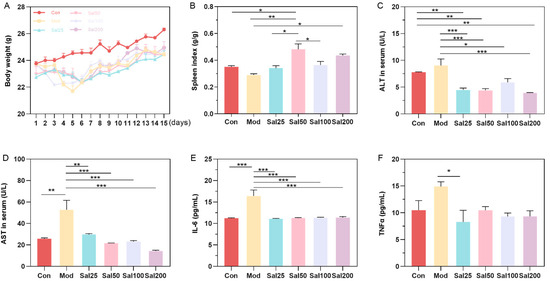 The effects of salidroside on mice weight (A), spleen index (B), and serum concentrations of alanine aminotransferase (ALT) (C), aspartate aminotransferase (AST) (D), IL-6 (E), and TNFα (F). The values are displayed as mean ± SEM. * p < 0.05, ** p < 0.01, *** p < 0.001.