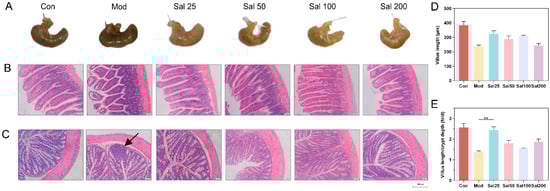 The effects of salidroside on mice intestinal damage. (A) Cecum tissues. (B) Ileum tissues. (C) Colon tissues. Scale bars indicate 150 μm. The black arrow indicates inflammatory infiltration. Histological analysis of the villus length (D) and the ratio of villus length to crypt depth (E).