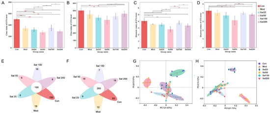 The effects of salidroside on the structure of gut microbiota. (A,B) Changes in Chao indexes after 7 and 14 days, respectively. (C,D) Changes in Shannon indexes after 7 and 14 days, respectively. (E,F) Veen analysis after 7 and 14 days, respectively. (G,H) Principal co-ordinates analysis (PCoA) analysis after 7 and 14 days, respectively. * p < 0.05, ** p < 0.01, *** p < 0.001.