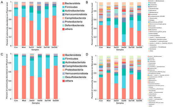 The effects of salidroside on the gut microbiota composition. (A,C) The composition at the phylum level after 7 and 14 days, respectively. (B,D) The composition at the genus level after 7 and 14 days, respectively.