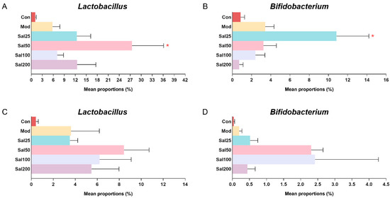 The effects of salidroside on probiotic abundance. (A,C) The abundance of Lactobacillus after 7 and 14 days, respectively. (B,D) The abundance of Bifidobacterium after 7 and 14 days, respectively. * p < 0.05 compared with the Mod group.
