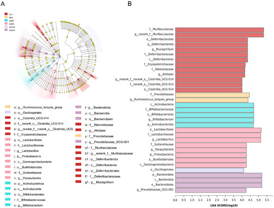 An linear discriminant analysis (LDA) effect size (LEfSe) analysis and LDA score for taxa differing between six groups. (A) The taxonomic cladogram obtained from the LEfSe analysis of gut microbiota. (B) The LDA score obtained from LEfSe analysis of gut microbiota in different groups. LDA score was set at 4.