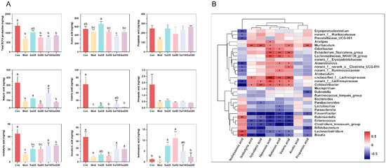The effects of salidroside on short-chain fatty acid (SCFA) production. (A) The contents of SCFAs. The values are displayed as the mean ± SEM. Small letters show significant differences between groups (p < 0.05). (B) Heatmap of correlation analysis between gut microbiota and SCFAs (* p < 0.05, ** p < 0.01, *** p < 0.001).