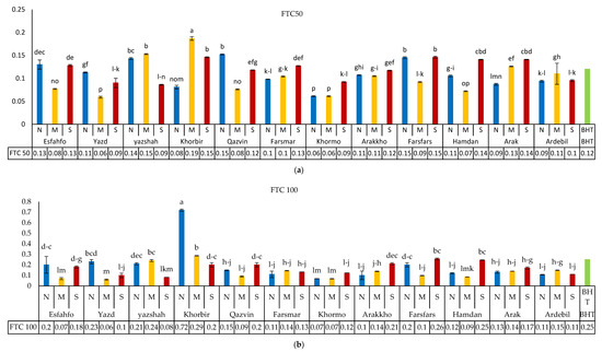 | Qazvin | 14.000 ± 0.6 h | 16.705 ± 0.6 l | 30.524 ± 1.4 b | 17.967 ± 0.6 jk | 13.901 ± 0.4 l | 18.444 ± 0.5 q | 5.330 ± 0.3 b | 9.439 ± 0.3 bc | |