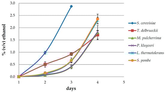 Ethanol production over time in early fermentation of Malvazija istarska (Vitis vinifera L.) white grape must inoculated with Saccharomyces cerevisiae and five non-Saccharomyces yeasts: Torulaspora delbrueckii, Metschnikowia pulcherrima, Pichia kluyveri, Lachancea thermotolerans, and Schizosaccharomyces pombe.