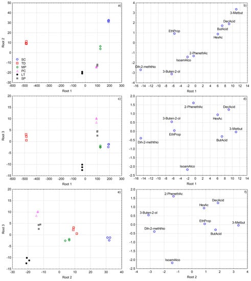 Separation of Malvazija istarska grape musts in early fermentation according to inoculated yeast species defined by the first three discriminant functions (roots) obtained by forward stepwise discriminant analysis on the basis of volatile aroma compound composition. Projection of grape must samples is shown in sub-figures (a,c,e), while standardized coefficients of the variables (volatile aroma compounds) are shown in sub-figures (b,d,f). Abbreviations: SC—Saccharomyces cerevisiae; TD—Torulaspora delbrueckii; MP—Metschnikowia pulcherrima; PC—Pichia kluyveri; LT—Lachancea thermotolerans; SP—Schizosaccharomyces pombe; Dih-2-meththio—dihydro-2-methyl-3(2H)-thiophenone; EthProp—ethyl propanoate; IsoamAlco—isoamyl alcohol; 2-PhenethAc—2-phenethyl acetate; HexAc—hexyl acetate; ButAcid—butanoic acid; DecAcid—decanoic acid; 3-Metbut—3-methylbutanal.