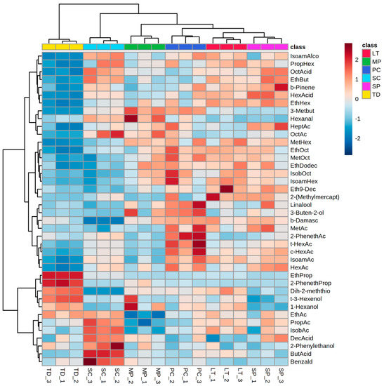 Hierarchical clustering analysis performed using volatile aroma compound composition of Malvazija istarska grape must in early fermentation by Saccharomyces cerevisiae and various non-Saccharomyces yeasts. The rows in the heatmap represent compounds, and the columns indicate samples. Colours of heatmap cells indicate low (dark blue), medium (white), and high (dark red) abundance of a particular compound. Abbreviations: IsoamAlco—isoamyl alcohol; PropHex—propyl hexanoate; OctAcid—octanoic acid; EthBut—ethyl butyrate; b-Pinene—β-pinene; HexAcid—hexanoic acid; EthHex—ethyl hexanoate; 3-Metbut—3-methylbutanal; HeptAc—heptyl acetate; OctAc—octyl acetate; MetHex—methyl hexanoate; EthOct—ethyl octanoate; MetOct—methyl octanoate; EthDodec—Ethyl dodecanoate; IsobOct—Isobutyl octanoate; IsoamHex—isoamyl hexanoate; Eth9-Dec—ethyl 9-decenoate; 2-(Methylmercapt)—2-(methylmercapto)benzothiazole; b-Damasc—β-damascenone; MetAc—methyl acetate; 2-PhenethAc—2-phenethyl acetate; t-HexAc—trans-hexen-1-yl acetate; c-HexAc—cis-hexen-1-yl acetate; IsoamAc—isoamyl acetate; HexAc—hexyl acetate; EthProp—ethyl propanoate; 2-PhenethProp—2-phenethyl propanoate; Dih-2-meththio—dihydro-2-methyl-3(2H)-thiophenone; t-3-Hexenol—trans-3-hexen-1-ol; EthAc—ethyl acetate; PropAc—propyl acetate; LT—Lachancea thermotolerans; MP—Metschnikowia pulcherrima; PC—Pichia kluyveri; SC—Saccharomyces cerevisiae; SP—Schizosaccharomyces pombe; TD—Torulaspora delbrueckii.