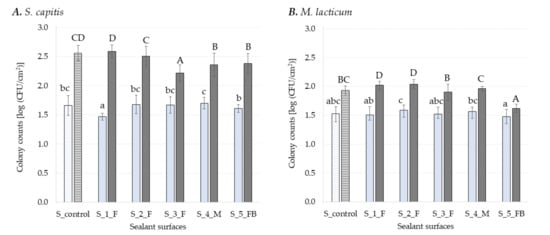 Counts of bacterial cells in early-stage biofilms (48 h) formed on sealants ranged between 1.62 ± 0.07 log CFU cm−2 for S_5_FB and 2.04 ± 0.08 log CFU cm−2 for S_2_F in case of M. lacticum. Incorporation of antibacterial agents into S_5_FB and S_4_M, reduced, therefore, the early-stage biofilm formation of M. lacticum by 21% and 4% respectively as compared to S_2_F. However, compared to the control surface (S_control) a significant reduction of 16% (p ≤ 0.05) was seen in the number of cells in the early-stage biofilm formed onto S_5_FB, but not onto S_4_M surface. The S_5_FB surface is the only one incorporating both fungicidal and antibacterial agents, most likely resulting in synergic effects in reducing biofilm formation of M. lacticum. Previous reports described synergic interactions between antibacterial and antifungal compounds [60,61]. However, such effects of S_5_FB on S. capitis biofilm growth was not observed. Therefore, it is assumed that the effects are bacterial strains specific. In future research, it would be also of interest to assess fungi or fungal spores to obtain holistic information on the effectiveness of the surface agents. Early-stage biofilms formed onto S_1_F and S_2_F, both incorporationg an antifungal agent were including significantly (p ≤ 0.05) higher numbers of cells compared to the control (S_control). For S. capitis, the highest mean value in the early-stage biofilm (48 h) was observed onto S_1_F (2.59 ± 0.11 log CFU cm−2) and the lowest mean value onto S_3_F (2.22 ± 0.14 log CFU cm−2) (Figure 1).