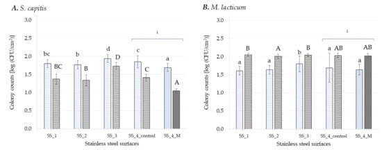 Log CFU cm−2 of S. capitis (A) and M. lacticum (B) enumerated on different stainless steel surfaces after 3 h (light blue) and 48 h (dark grey) of incubation. Surfaces with antimicrobial coatings are colored with a solid fill and surfaces without antimicrobials are highlighted with a pattern fill. Different lowercase letters denote significant differences (multiple range test, p ≤ 0.05) between the respective samples during adhesion (3 h), while uppercase letters indicate differences in early-stage biofilm formation (48 h). Each experiment was repeated in at least triplicates. 1 Same SS surface with and without antimicrobial agent.