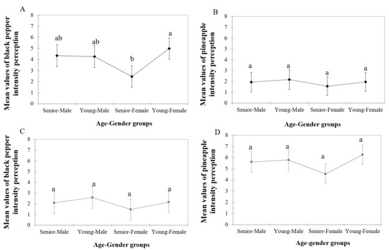 Effect of age–gender groups of consumers on the black pepper and pineapple aroma intensity retronasally perceived after tasting both wines: (A) black pepper intensity in red wine, (B) pineapple intensity in red wine, (C) black pepper intensity in white wine, (D) pineapple intensity in white wine. Different letters (a-b) show significant differences among age-gender groups from Tukey test (p < 0.05).