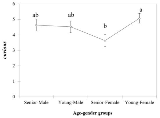 Mean scores (considering the two types of wines) of the emotional term “curious” according to the age–gender group. Different letters (a-b) show significant differences among age-gender groups from Tukey test (p < 0.05).