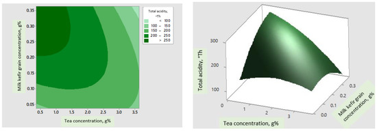 Figure 2 presents the contour and surface plots of the interactions between the response, TA and two independent variables, the milk kefir grains starter culture’s concentration and the black tea concentration. The acidification potential increased with the increase in the milk kefir grains’ concentration and the decrease in the black tea concentration.