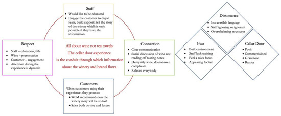 Mutual respect, the third finding, is essential for any sales and incorporates the importance of respecting all aspects of the CDE, including staff, winescape, and winery ambience. This finding supports the research of Charters et al. [24] and O’Neill et al. [25], which confirms that welcoming and knowledgeable staff who consistently co-create positive CDEs lead to increased sales, re-visitation, and word-of-mouth recommendation, while establishing a relationship that is essential for developing enduring customers.