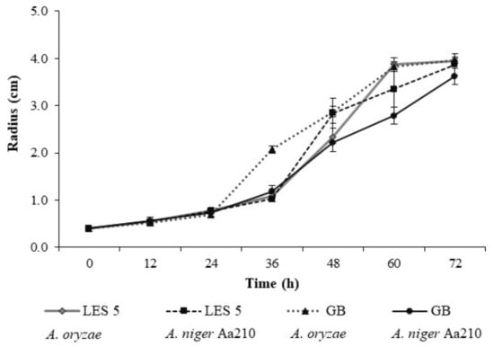 For the radial growth assay and SSF, the initial pH values were 6.71 for LES 5 and 6.72 for GB. In Figure 1, the development of A. niger Aa210 on the substrate of the two sorghum genotypes was slightly lower than that of A. oryzae. Among the two analyzed strains, A. oryzae was the one that showed the highest growth speed, especially after 36 h in GB, so that between 60 and 72 h they managed to completely colonize the Petri dish. However, the growth analysis reflected similar behaviors between the two fungi since both allowed their development on the substrates at 72 h, as can be seen in Figure 1.