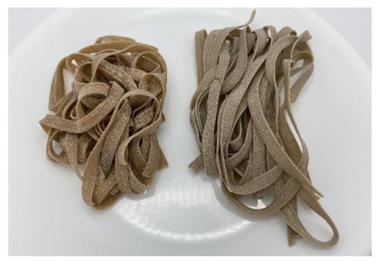 - Technical, A. Pasta and Noodle Cooking Quality—Firmness. In AACC International Approved Methods; AACC International: St. Paul, MN, USA, 2009. [Google Scholar] [CrossRef]