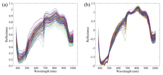 (a) Raw; (b) SNV preprocessed spectral curves of all potato samples.
