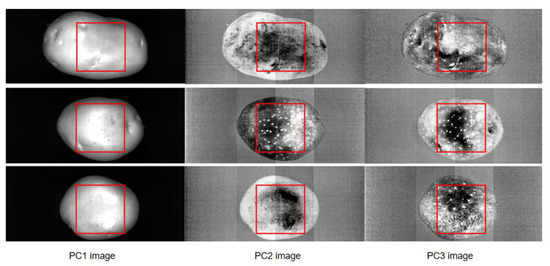 The obtained hyperspectral images contained continuous grayscale images at 428 wavelengths, producing a redundant, computationally intensive block of three-dimensional data. Therefore, dimensionality reduction of the hyperspectral data was necessary, for which we used principal component analysis (PCA). PCA is a classic data dimensionality reduction algorithm [13], and it was used to transform the original 428-dimensional grayscale image to the first 3-dimensional PC images, namely the PC1, PC2, and PC3 images. For each sample, three PC images were collected; thus, a total of 96 × 3 = 288 PC images were obtained.